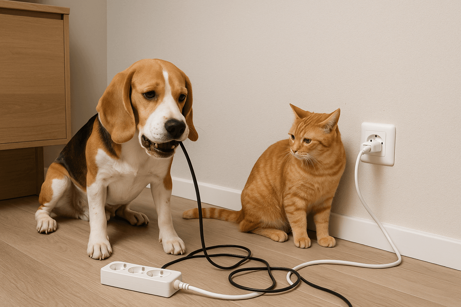 Comportamento curioso de cães e gatos exige atenção redobrada com fios, tomadas e aparelhos